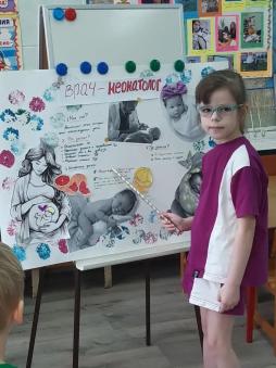 Воспитанница группы "Солнышко" подготовила для ребят выступление о враче-неонатолог. Дети узнали, что именно врач-неонатолог помогает малышу сделать первый вдох, впервые закричать, осматривает ребенка и при необходимости оказывает ему помощь.